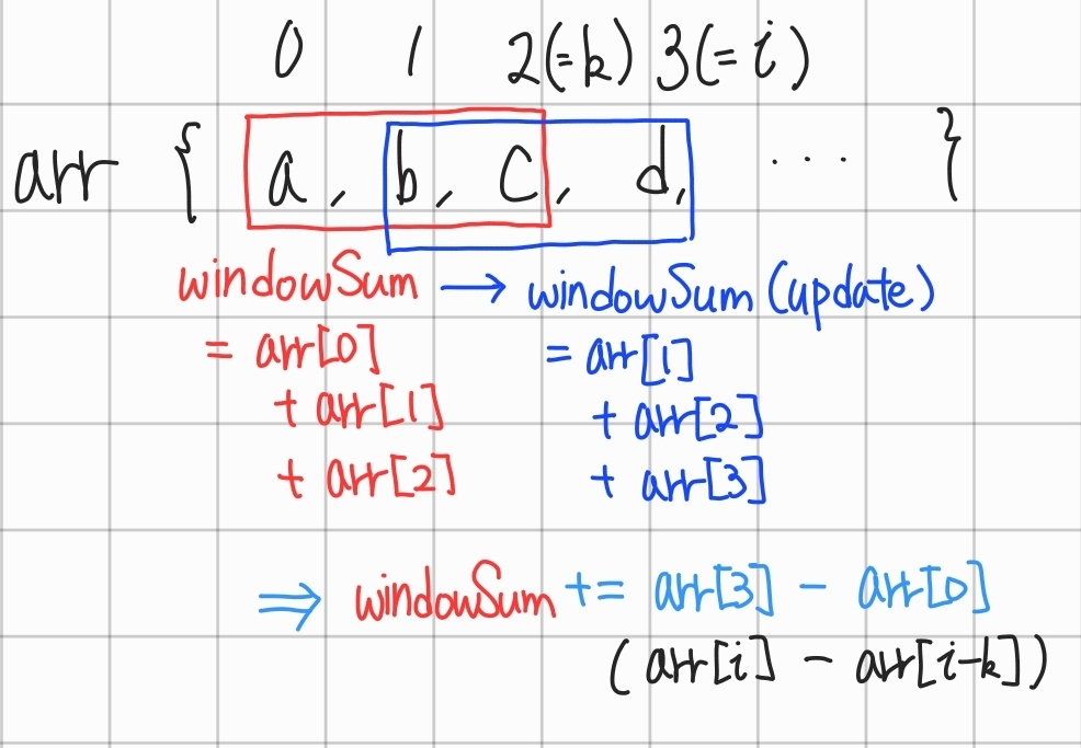 대표적인 문제로 크기가 k인 부분 배열의 최대합을 구하는 문제가 있다.